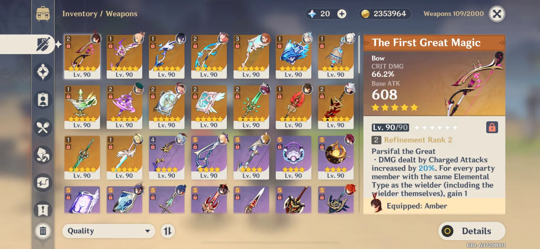 some r2 (redhorn, lyney bow, kaguras, elegy, lost prayer, skyward atlas, pjws) and 1 r3 harp . the rest are r1